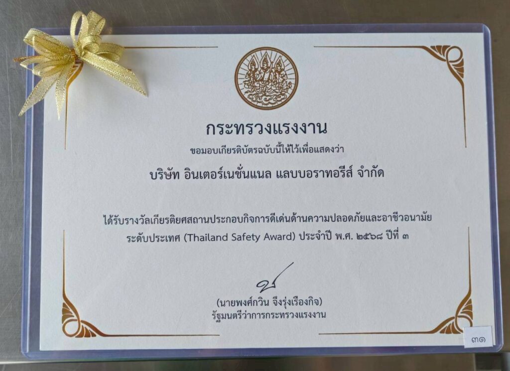 วันที่ 2 ธันวาคม 2568 บริษัท อินเตอร์เนชั่นแนล แลบบอทอรีส์ จำกัด โดยคุณนฤมล ศรีวิริยะเลิศกุล (พี่แป้น) กรรมการผู้จัดการฝ่ายโรงงาน เข้ารับรางวัลสถานประกอบการดีเด่นด้านความปลอดภัย อาชีวอนามัยและสภาพแวดล้อมในการทำงานระดับประเทศ ต่อเนื่องปีที่ 3